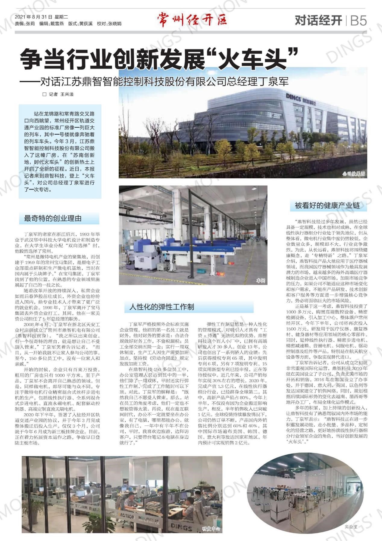The product quality has been widely recognized by the society and attracted the attention of the mainstream media in Changzhou. Wujin daily published on August 31, 2021 published a special report on " Jiangsu DINGS’ Intelligent Control Technology Co., Ltd " in B5 page, entitled "Striving to be the “Locomotive” for industrial innovation and development". This paper provides an in-depth report on the Entrepreneurship, human-based management mode and future market positioning planning of Mr. Ding Quanjun, General Manager of company