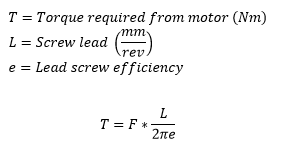 La formule ci-dessous est utilisée pour trouver le couple rotatif requis du moteur, en fonction de la force, du pas et du rendement de la vis mère.