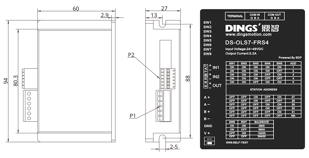 | Signal 5V sélectionnable par DIP | Entrée opto-isolée : H = 3.5–5V, L = 0–0.8V, courant d'entrée 6–15mA, fréquence de réponse maximale 200kHz |